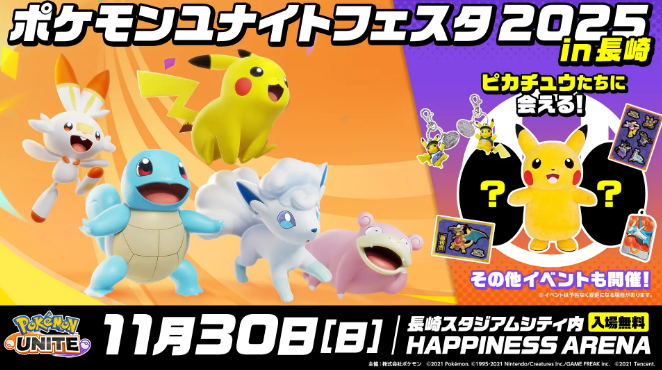 eスポーツ/交流イベントとして、スマートフォンゲーム ポケモンユナイト の体験型イベント「ポケモンユナイトフェスタ in 長崎 2025」が、2025年11月30日(日)に 長崎スタジアムシティ HAPPINESS ARENA(長崎市)で開催されると主催の 株式会社ポケモン が発表した。