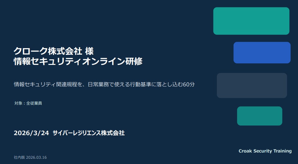 ライブ配信事業を手がけるクローク株式会社が、情報セキュリティオンライン研修を実施。サイバーレジリエンス社の佐野氏を講師に迎え、業務に直結する60分の実践的プログラムが注目を集めている。